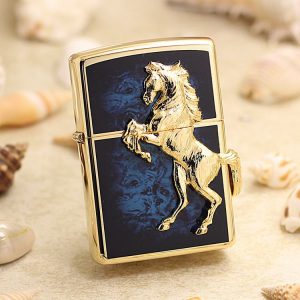 Zippo ốp hình ngựa mạ vàng, nền men xanh ZBT-5-3B