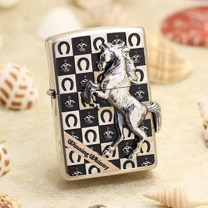 Zippo ốp hình ngựa mạ bạc, nền họa tiết caro ZBT-5-3D