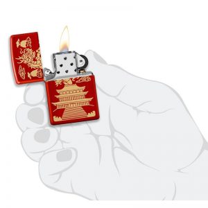 - Chất liệu vỏ: Đồng thau nguyên khối, khắc laser hình Rồng bay trên một ngôi đền cổ trên bật lửa đồng thau, nền mạ màu đỏ ánh kim.