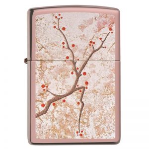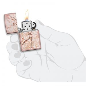 - Chất liệu vỏ: Đồng thau nguyên khối, hình ảnh cây hoa anh đào in trên mặt trước của bật lửa High Polish Rose Gold.