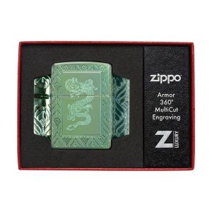 Chiếc bật lửa đồng thau mạ Chrome màu xanh lá cây bóng ,được hãng Zippo kết hợp công nghệ khắc sâu MultiCut 360 độ, phác họa hình ảnh hoa văn bao quanh 4 mặt Zippo và hình ảnh chú rồng dùng công nghệ khắc Ăn mòn Axit ở mắt trước.