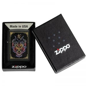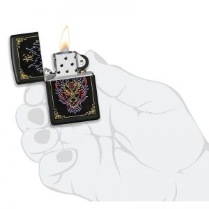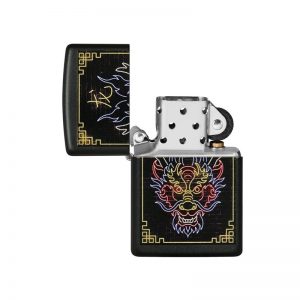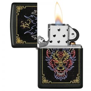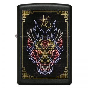 - Chất liệu vỏ: Đồng thau nguyên khối, Được thể hiện trên bật lửa Zippo đồng thau, nền sơn tĩnh điện Black Matte là mặt Rồng Neon sáng lên, nằm trên nền gạch tối và được bao quanh bởi một đường viền neon vàng.