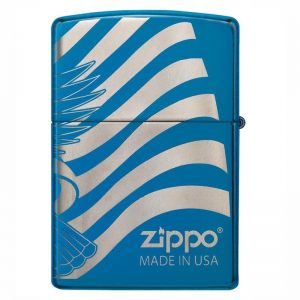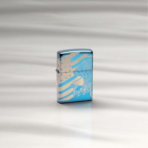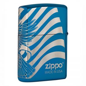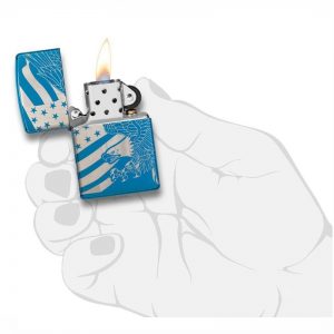 - Chất liệu vỏ: Đồng thau nguyên khối, khắc 360 ° một con Đại Bàng đầu trắng và lá cờ Mỹ quấn quanh bật lửa xanh.