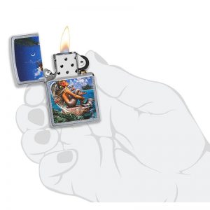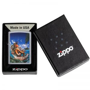 - Chất liệu vỏ: Đồng thau nguyên khối, Zippo và Rick Rietveld hợp tác một lần nữa để tạo ra thiết kế nghệ thuật là một nàng tiên cá xinh đẹp, đang thơ thẩn trên một tảng đá trong một thiên đường nhiệt đới.