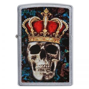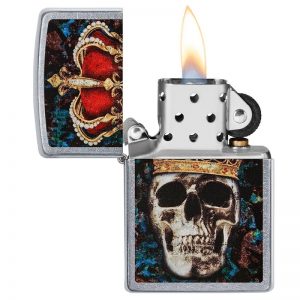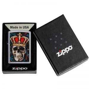 - Chất liệu vỏ: Đồng thau nguyên khối, Thể hiện trên bật lửa Zippo Street Chrome là hình đầu lâu quý tộc, đội trên vương miện hoàng gia